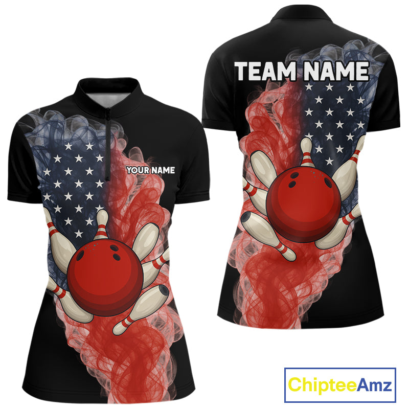 Custom Smoke American Flag Black Bowling Shirts for Women Personalized Patriotic Team Bowling Jerseys NQS10496