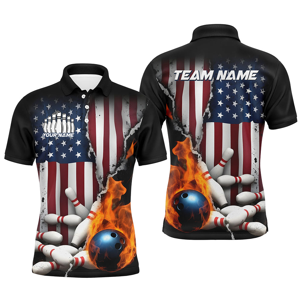 Flaming Bowling Ball Custom Patriotic Bowling Team Shirts For Men, US Flag Bowling League Shirt IPHW7725