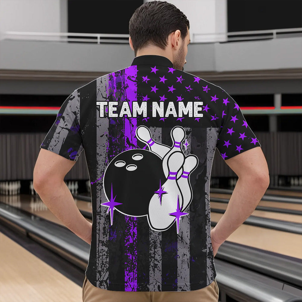 Purple And Black Grunge American Flag Patriotic Bowling Shirts For Men Custom Bowling Team Jerseys TDM3697