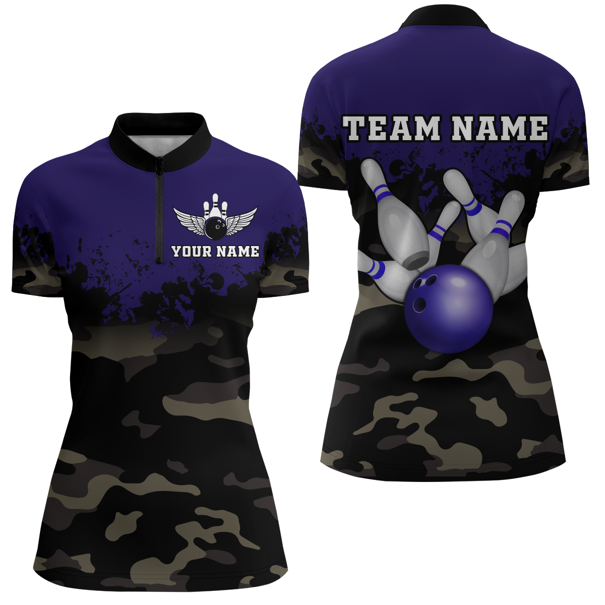 Personalized 3D Quarter Zip Bowling Team Shirts Women Camouflage Bowling Jersey QZT503