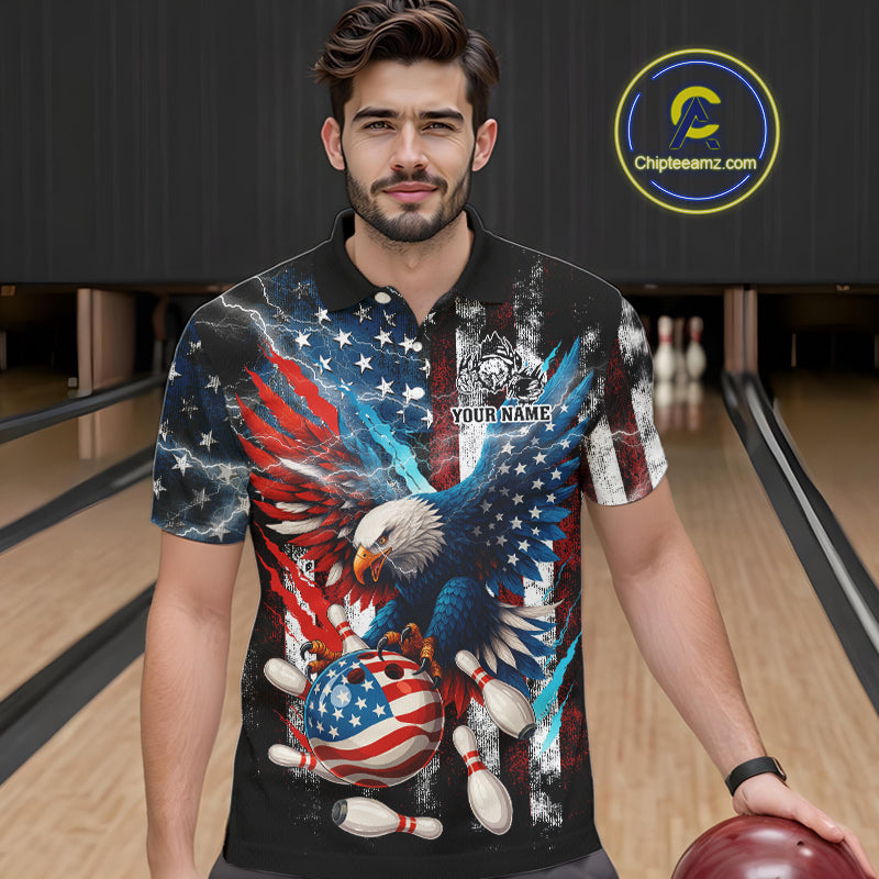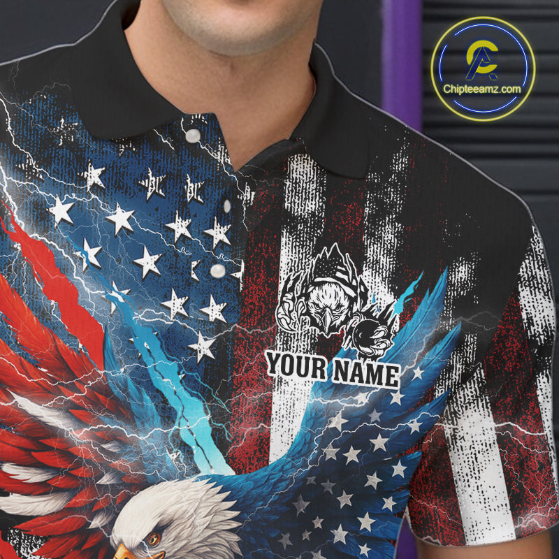 Personalized American Flag Eagle Lightning Thunder Bowling Team Shirt For Men, Patriotic Bowling Gift NQS10834