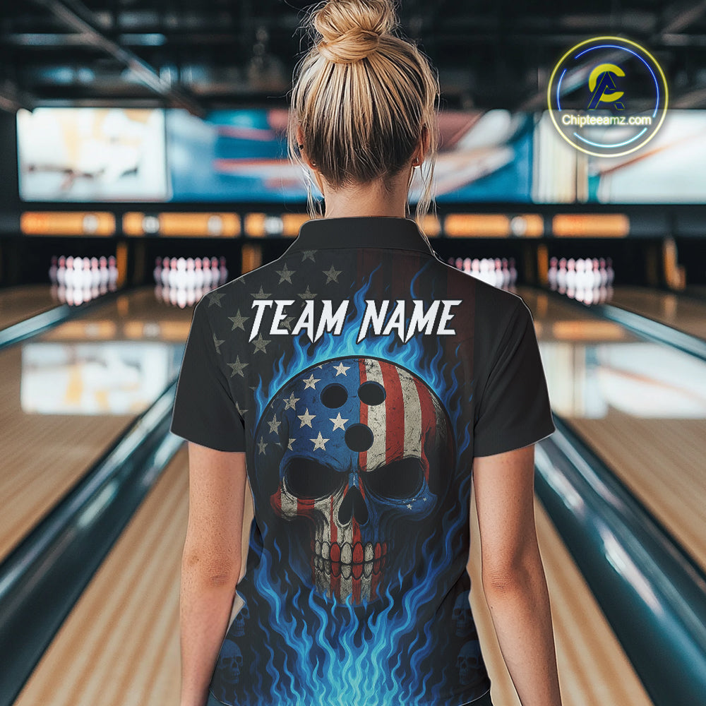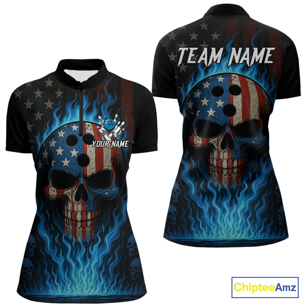 Personalized Blue Flame American Flag Skull Patriotic Bowling Polo, Quarter Zip Shirts for Women NQS10914