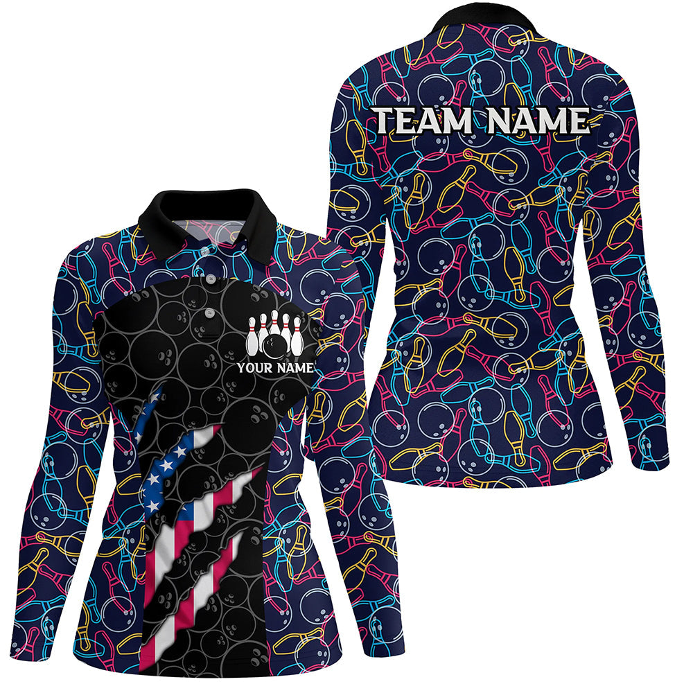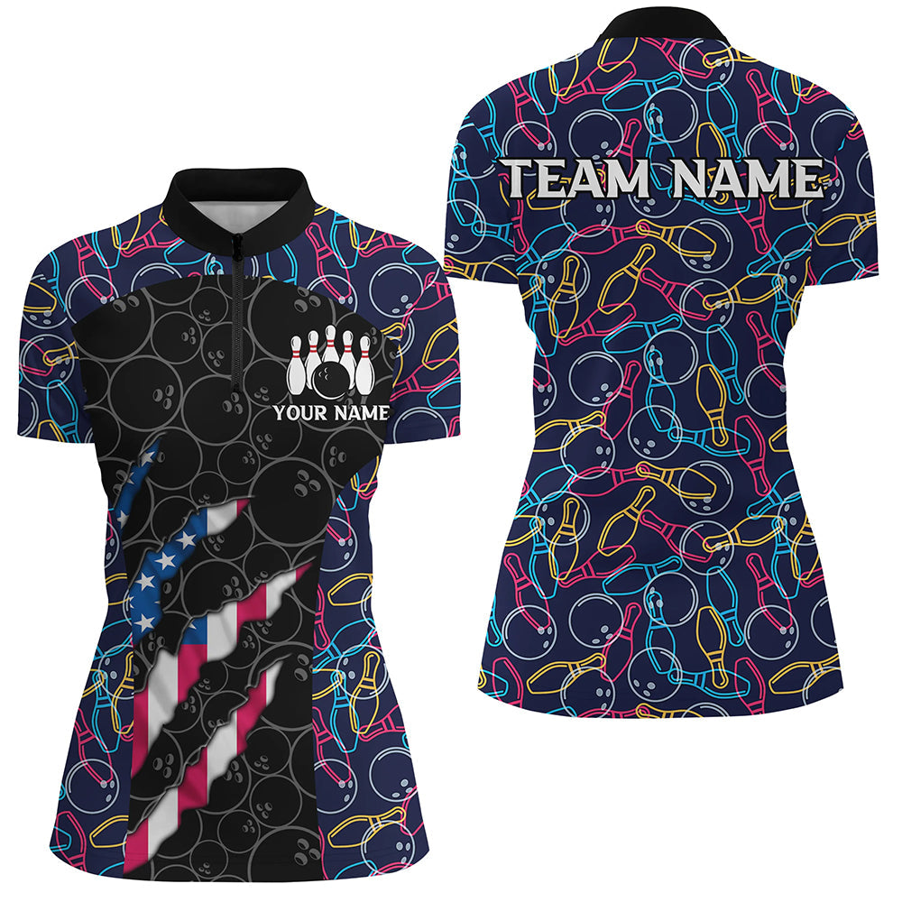 Personalized Bowling Camo American Flag Bowling Team Shirts For Women, Patriotic Bowler Outfits NQS8613