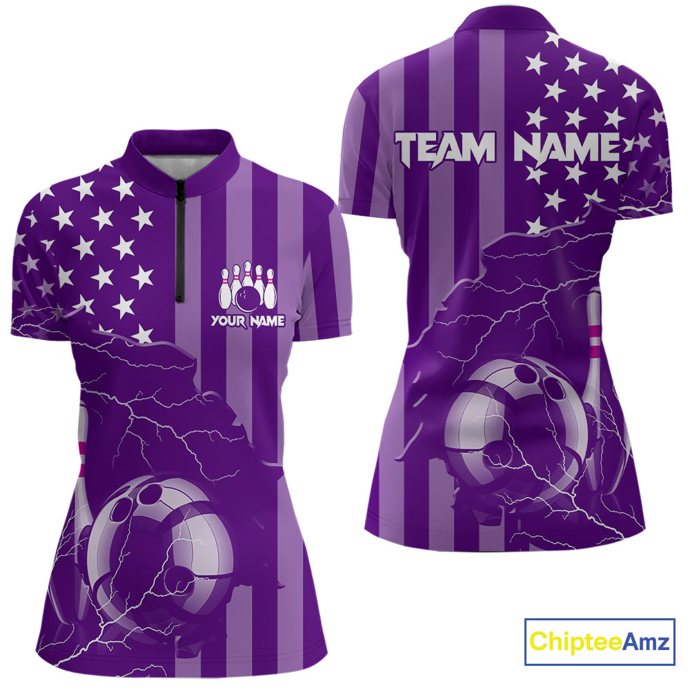 Personalized Purple American flag Lightning thunder Custom Women Bowling Team Shirts Bowling Jersey NQS9858