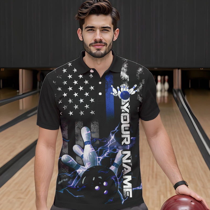 Custom Black And Blue Thin Line American Flag Patriotic US Bowling Team Polo Shirts For Men IPHW8518