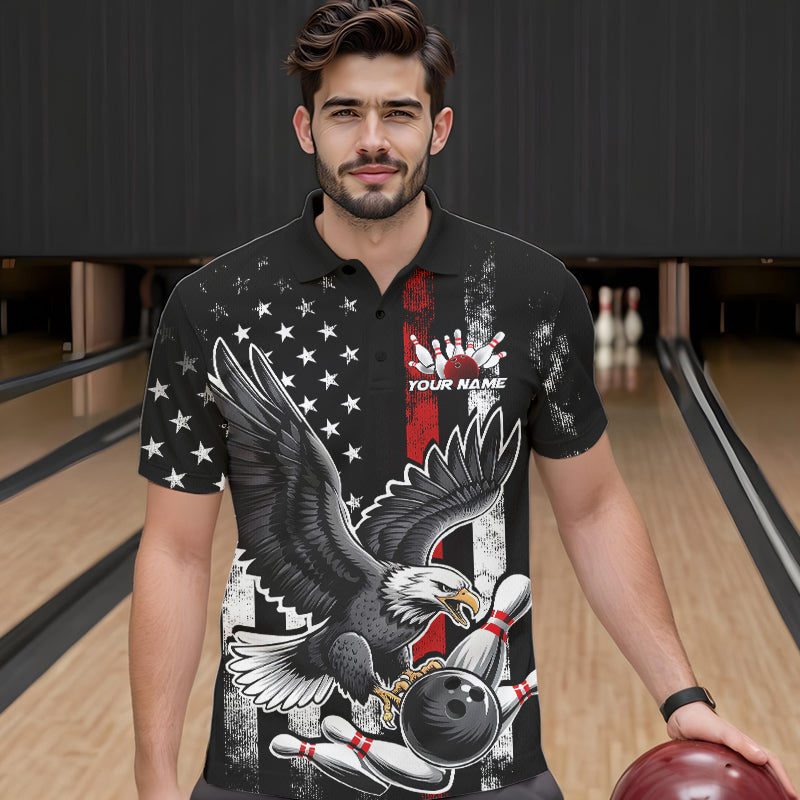 Custom Red Line American Flag Eagle Bowling Men Polo Shirt, Patriotic US Bowling Shirt IPHW8939