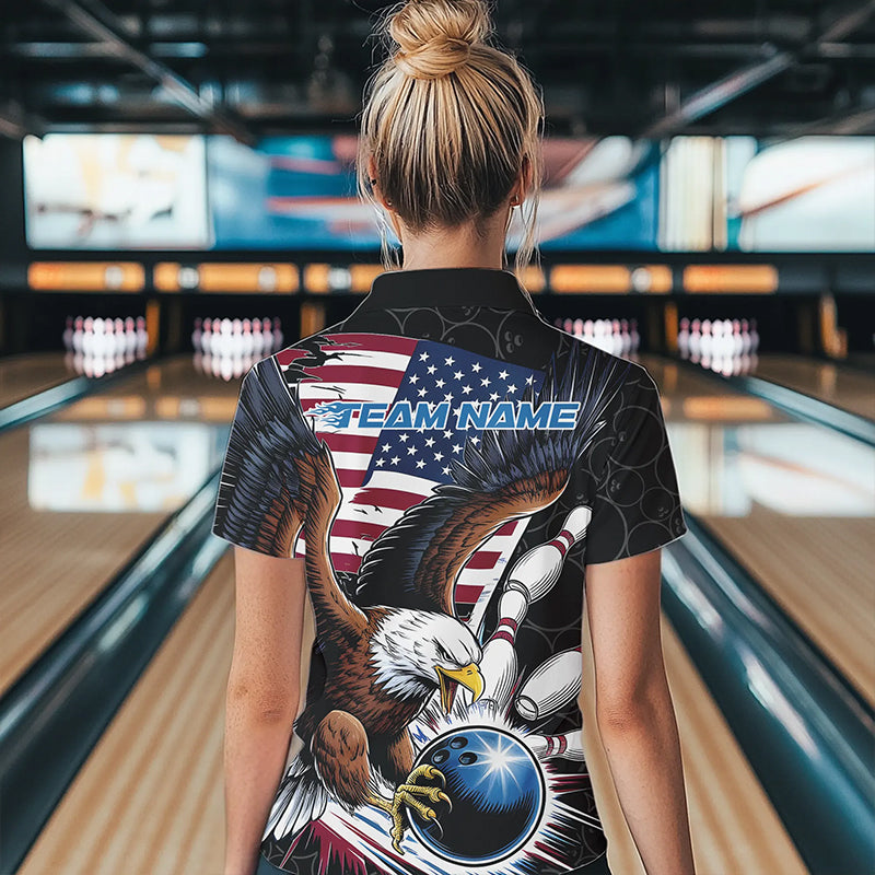 Custom American Flag Eagle Bowling Team Women Polo Shirt, Patriotic US Bowling League Shirt IPHW8752