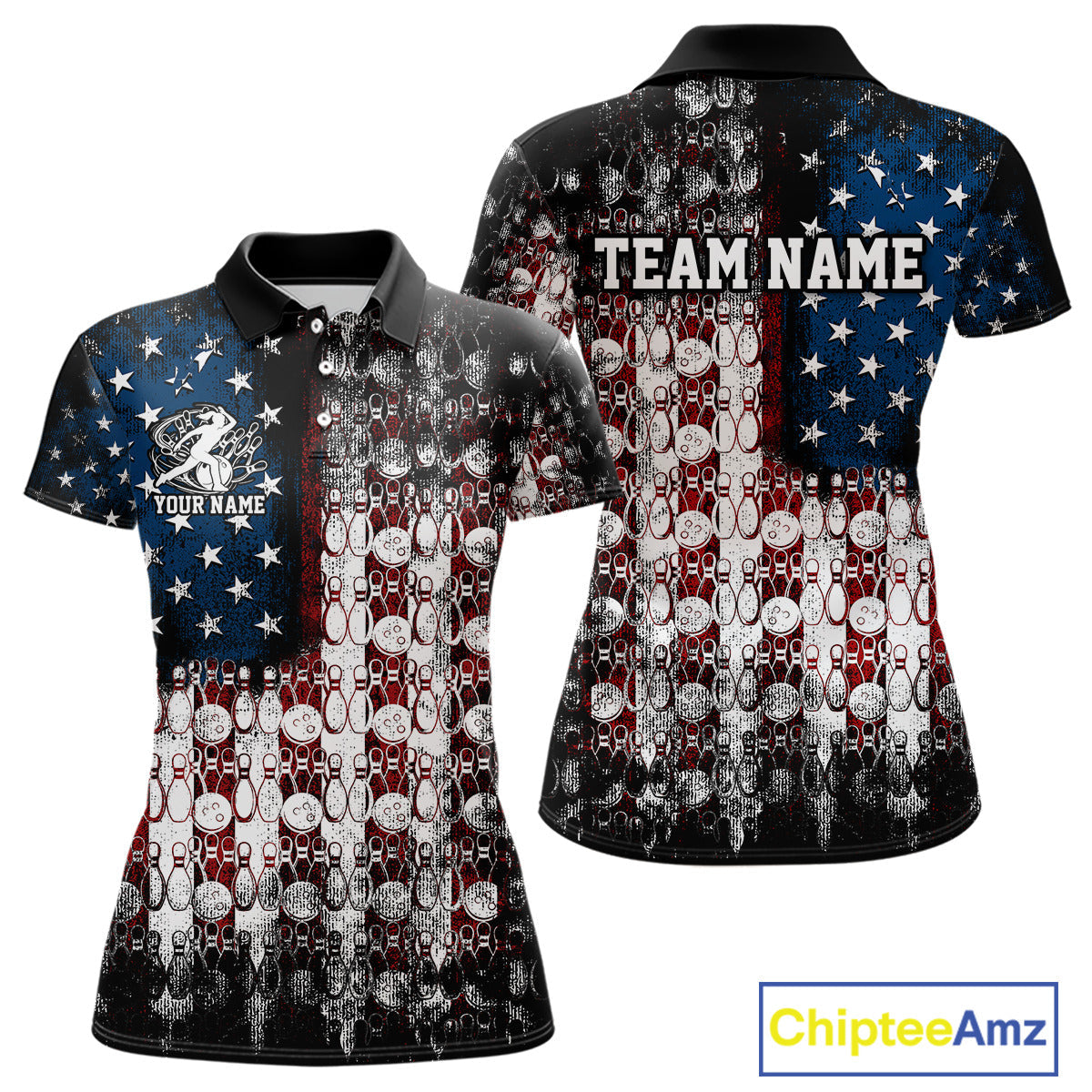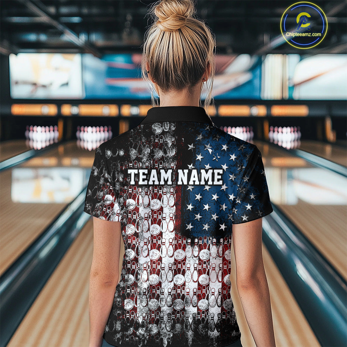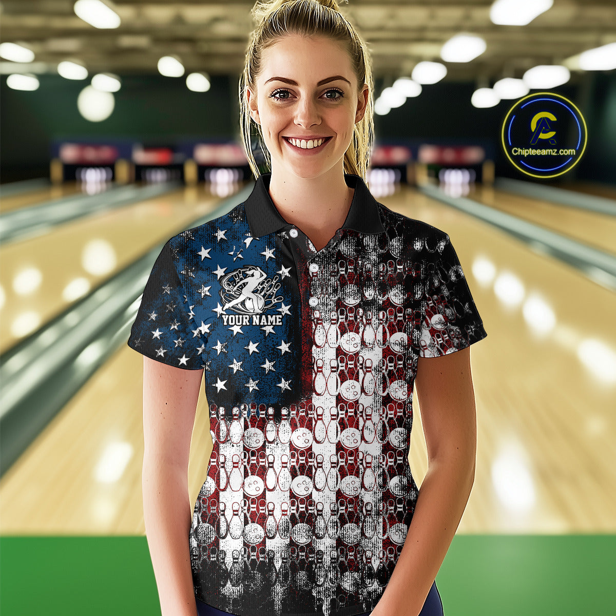 Custom Patriotic US Flag Bowling Women Polo Team Shirts, American Bowling League Shirt IPHW9325