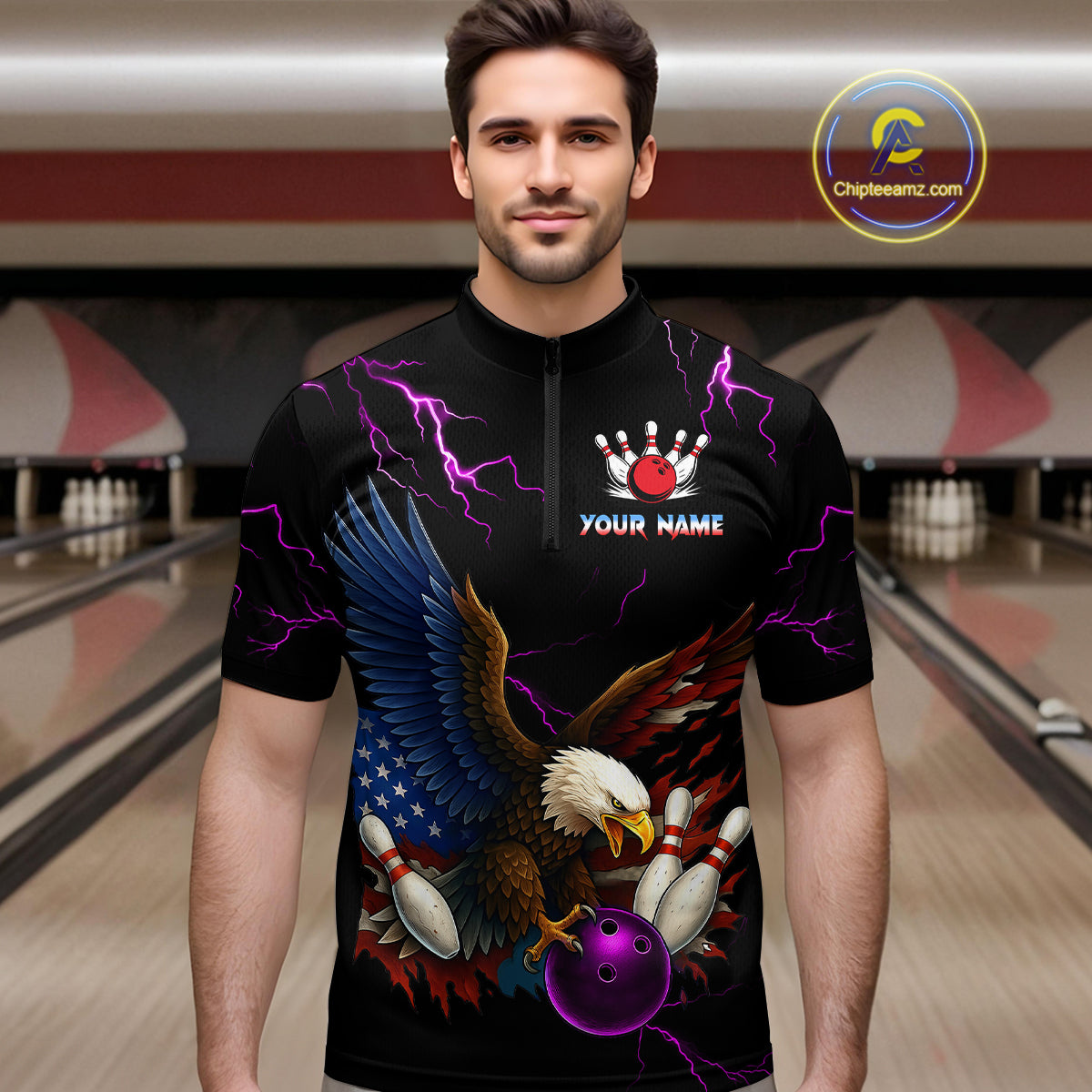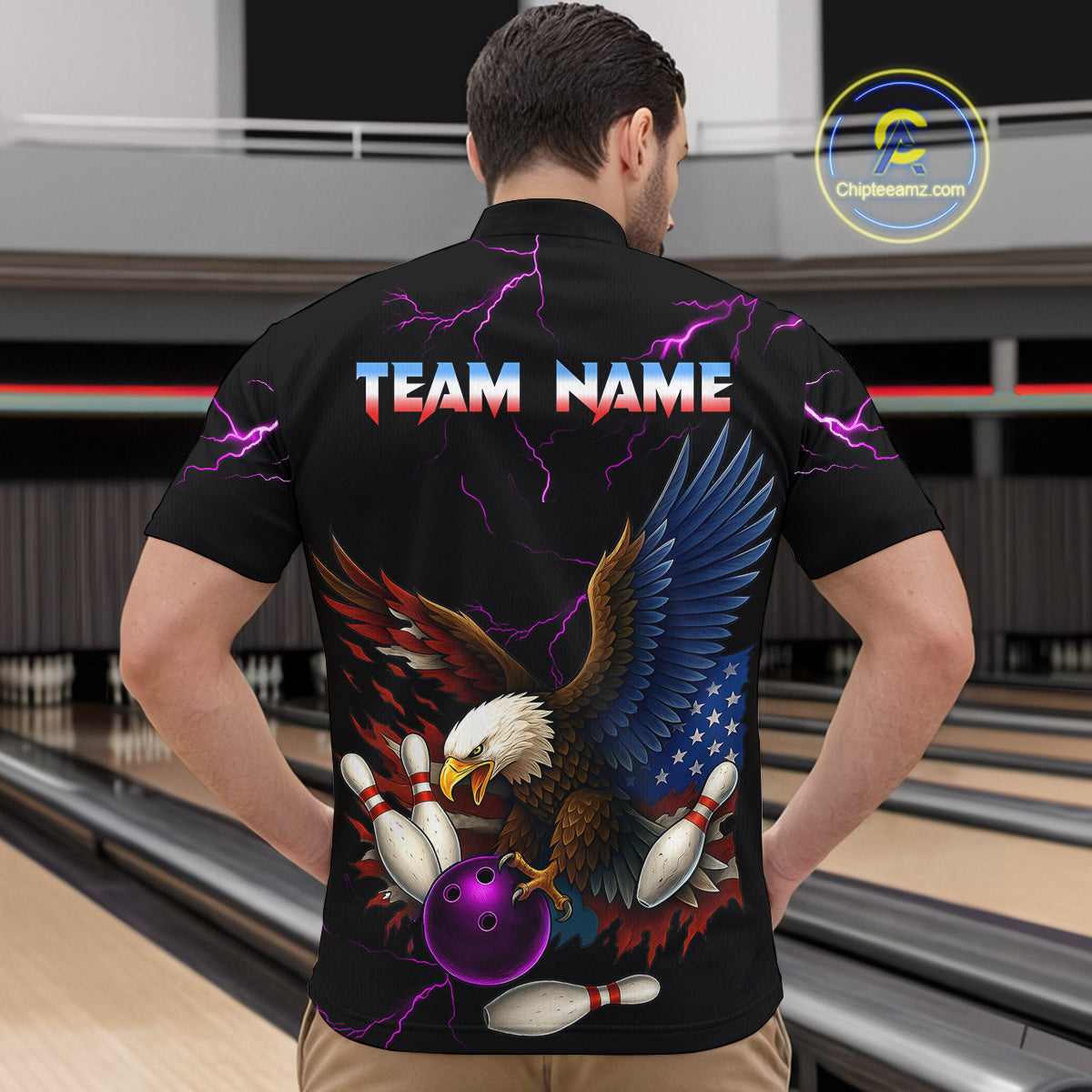 Purple Thunder US Flag Eagle Bowling Shirts for Men Team Bowling Polo & Quarter-Zip HNT96