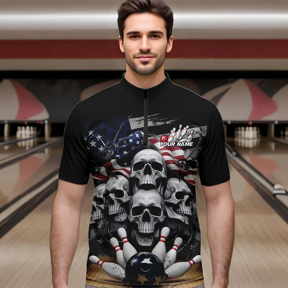 Custom US Flag Skull Bowling Team Quarter-Zip Shirts For Men, Patriotic Bowling League Shirt IPHW8383