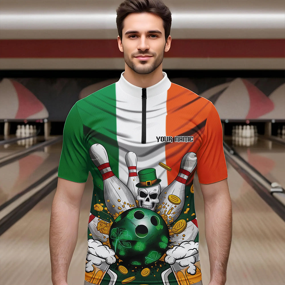 Custom Irish Flag St Patricks Day Bowling Quarter-Zip Team Shirts For Men, Skull Leprechaun Bowling IPHW8588