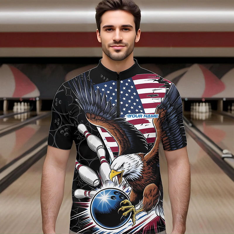 Custom American Flag Eagle Bowling Team Men Quarter-Zip Shirts, Patriotic US Bowling League Shirt IPHW8752