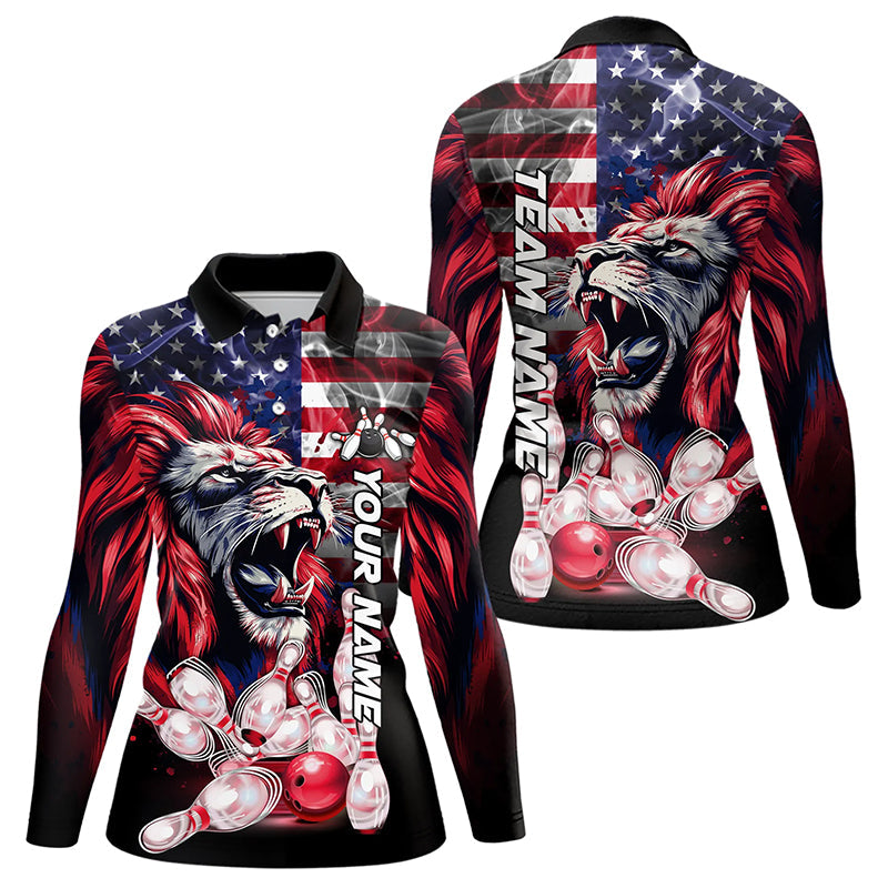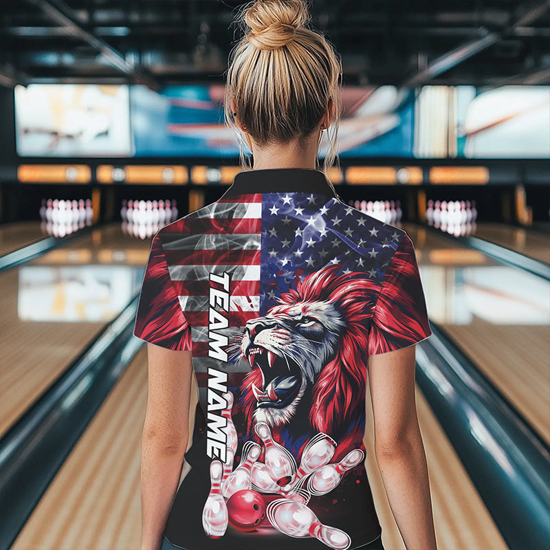 Smoke American Flag Lion Bowling Polo, 1/4 Zip Shirts for Women Custom patriotic Team Bowling jerseys NQS9670