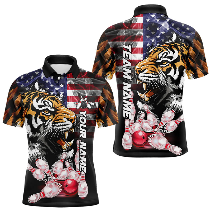 Smoke American Flag Tiger Bowling Polo, 1/4 Zip Shirts for Men Custom patriotic Team Bowling jerseys NQS9672