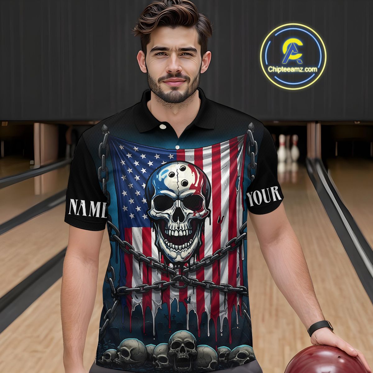US Flag Skull Bowling Custom Men Bowling Shirt Polo & Quarter-Zip Bowling Team Shirts HNT74