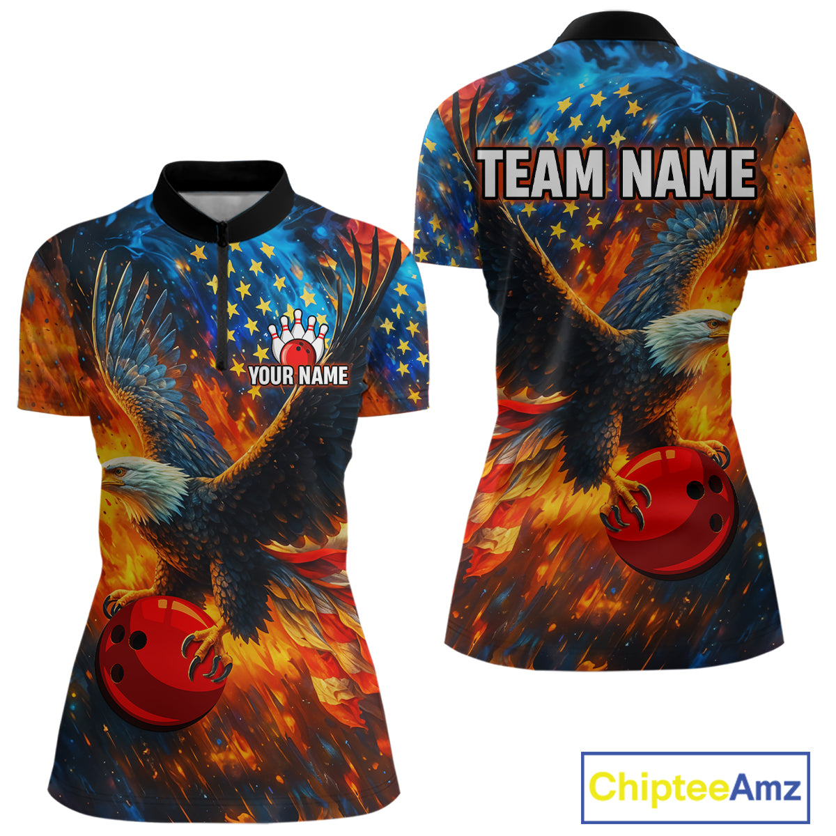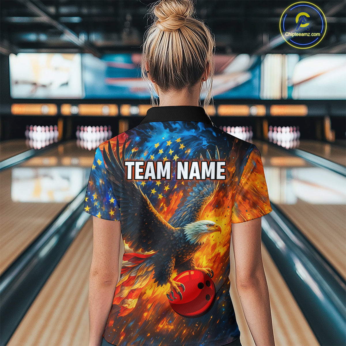 Personalized Orange Flaming American Flag Bowling Shirt For Women Custom Eagle Bowling Team Jersey TDM4642