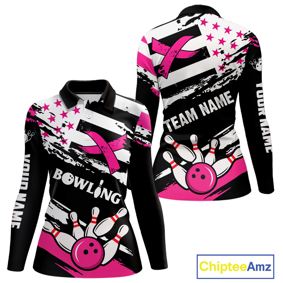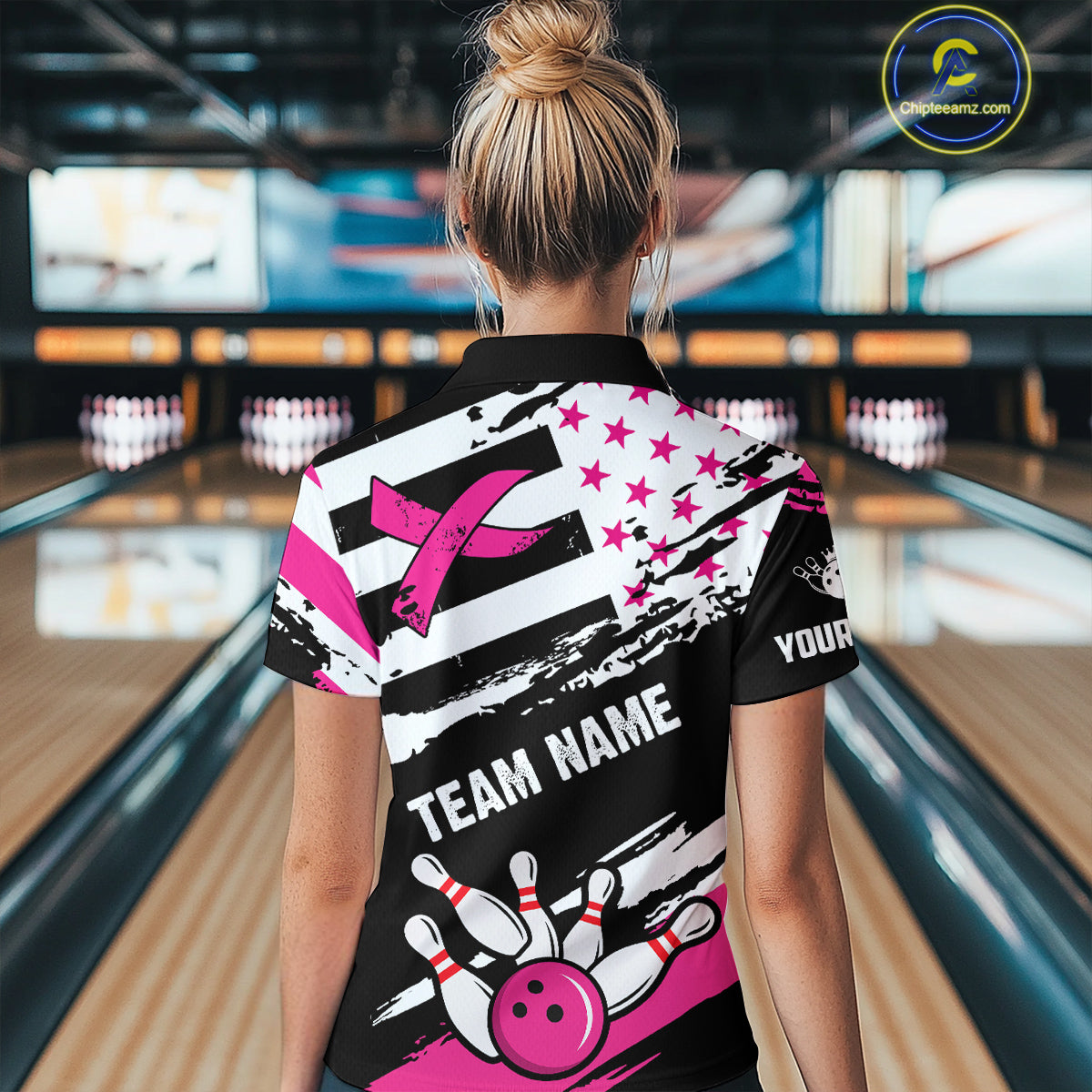 Breast Cancer Awareness American Flag Bowling Shirt For Women Custom Pink Ribbon Bowling Team Jersey TDM4655