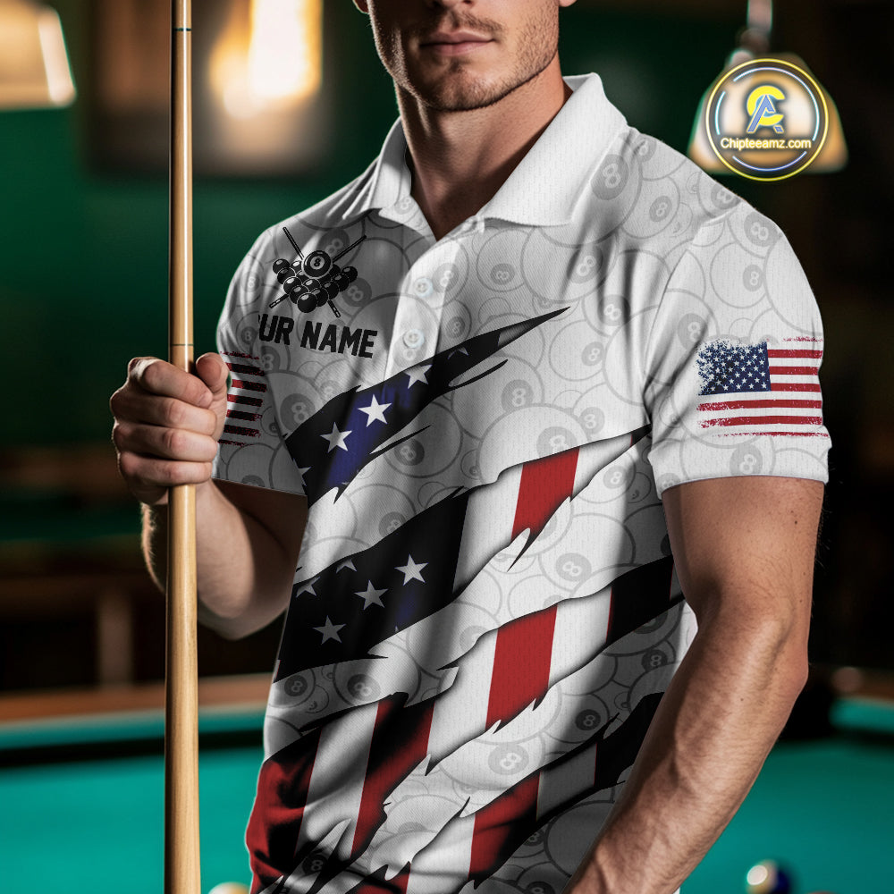 Personalized American Flag Billiard Shirts For Men, Patriotic 8 Ball Pool Team Jersey | White TDM4026