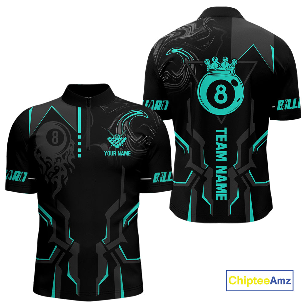 Custom 8 Ball Pool Crown Men Billiard Shirts, Turquoise And Black Billiard Team Shirt, Pool Jersey TDM4052
