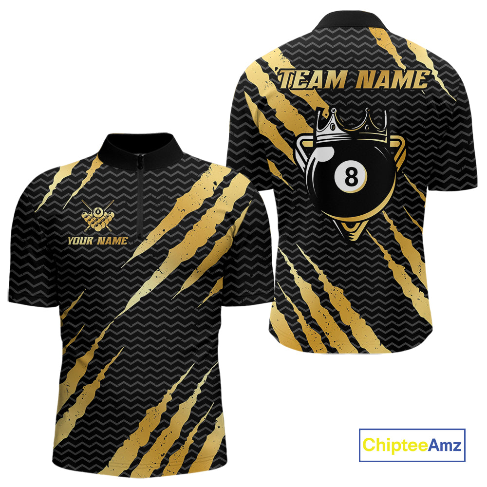 Black And Gold Scratch Billiard Shirts For Men Custom 8 Ball Crown Pool Team Jersey Polo & 1/4 Zip TDM4095