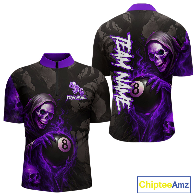 Grim Reaper Custom Flame 8 Ball Pool Billiard Shirt For Men, Purple Black Billiard Team Jersey TDM4121
