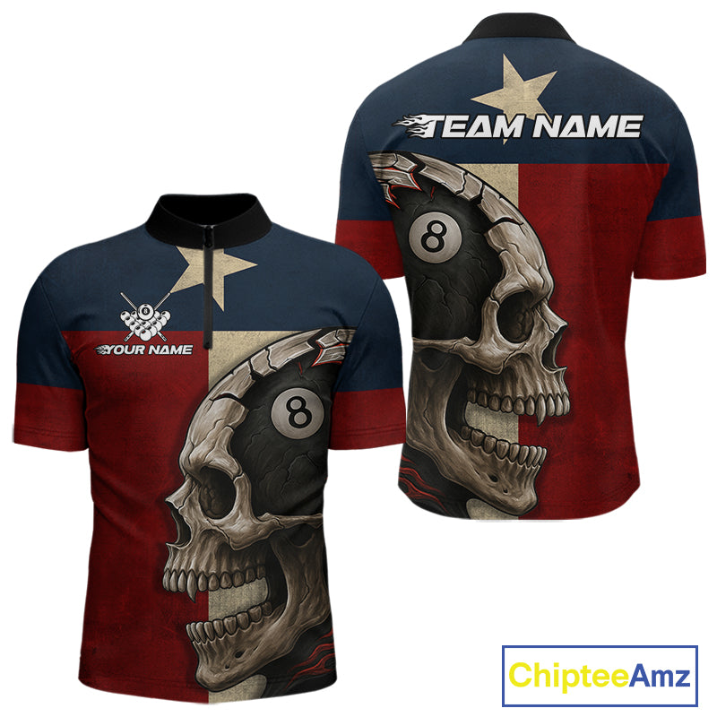 Personalized Grunge Texas Flag Skull Billiard Shirt For Men, 8 Ball Patriotic Pool Team Jerseys TDM4158