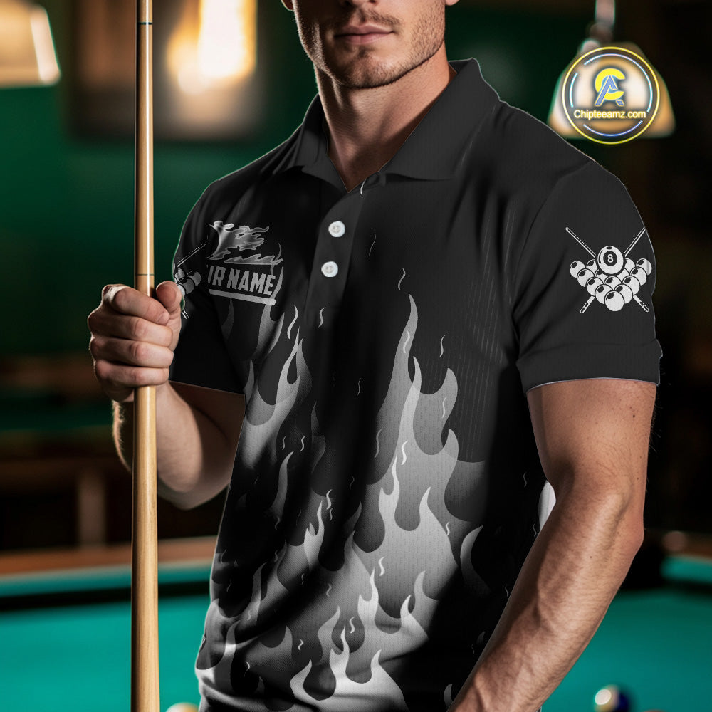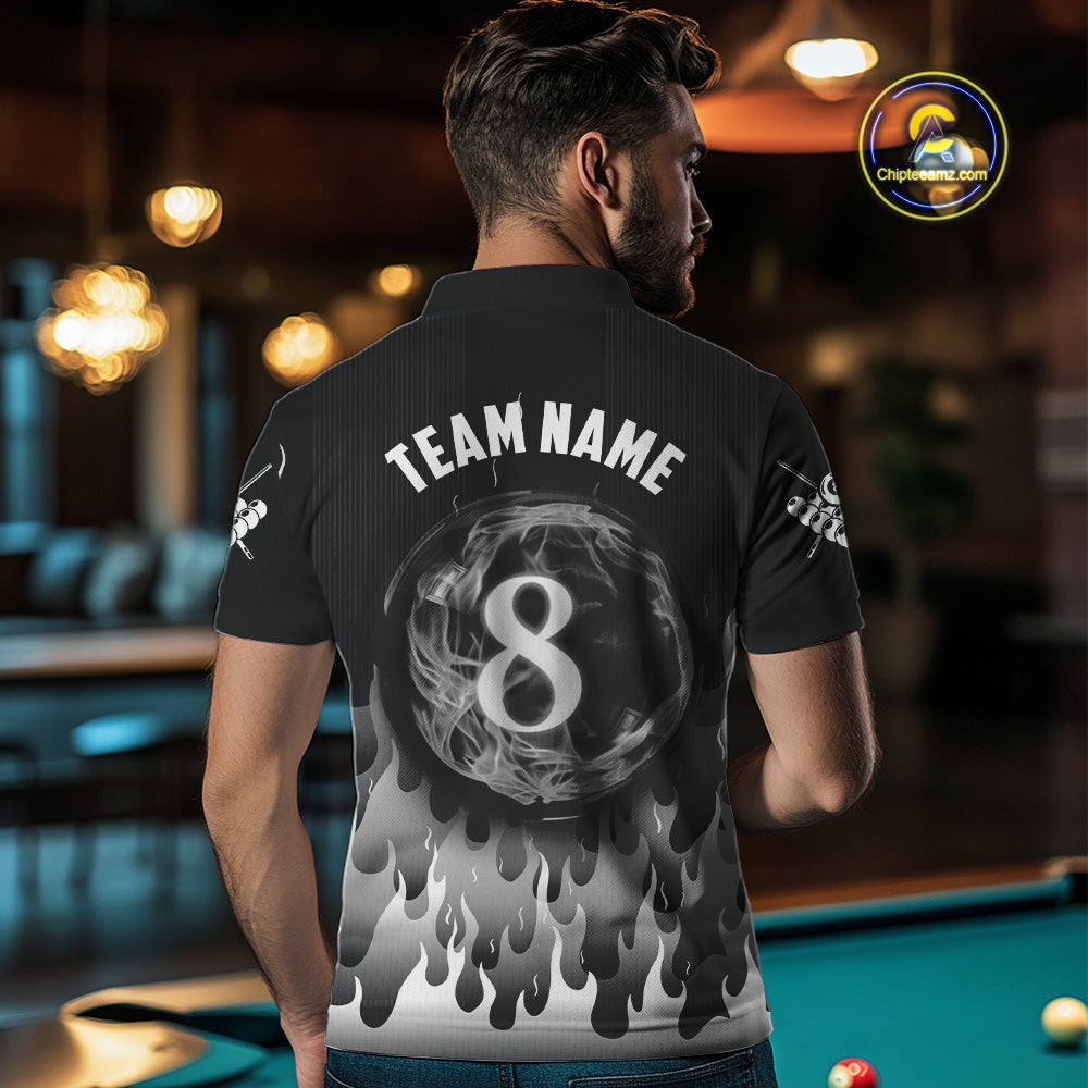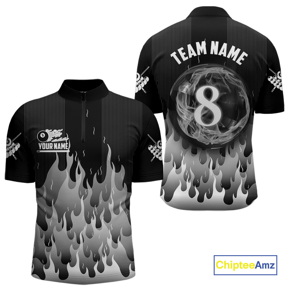 Black And Grey Flaming 8 Ball Pool Men Billiard Polo & 1/4 Zip Custom Pool Team Player Jersey TDM4186