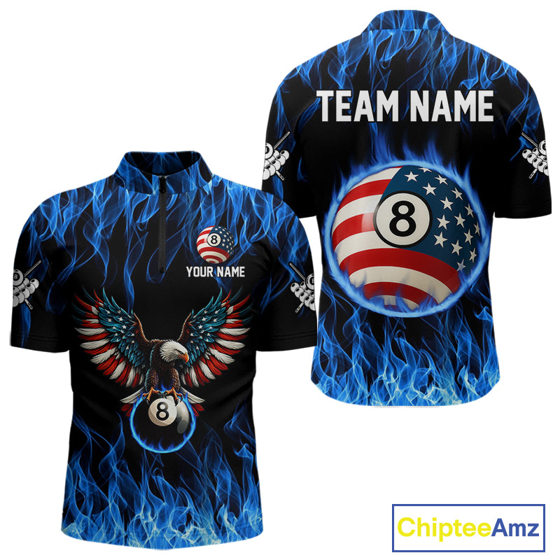 Blue Flaming American Flag Eagle 8 Ball Billiard Shirt For Men Custom Patriotic Pool Team Jersey TDM4231
