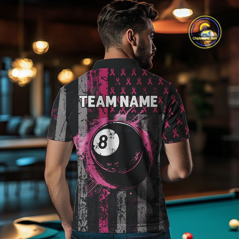 Custom Pink Ribbon Grunge US Flag Billiard Shirt For Men, Breast Cancer 8 Ball Pool Team Jersey TDM4500