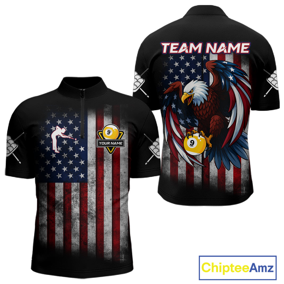 Grunge American Flag Eagle 9 Ball Billiard Polo & 1/4 Zip Custom Men's Patriotic Pool Team Jersey TDM4516