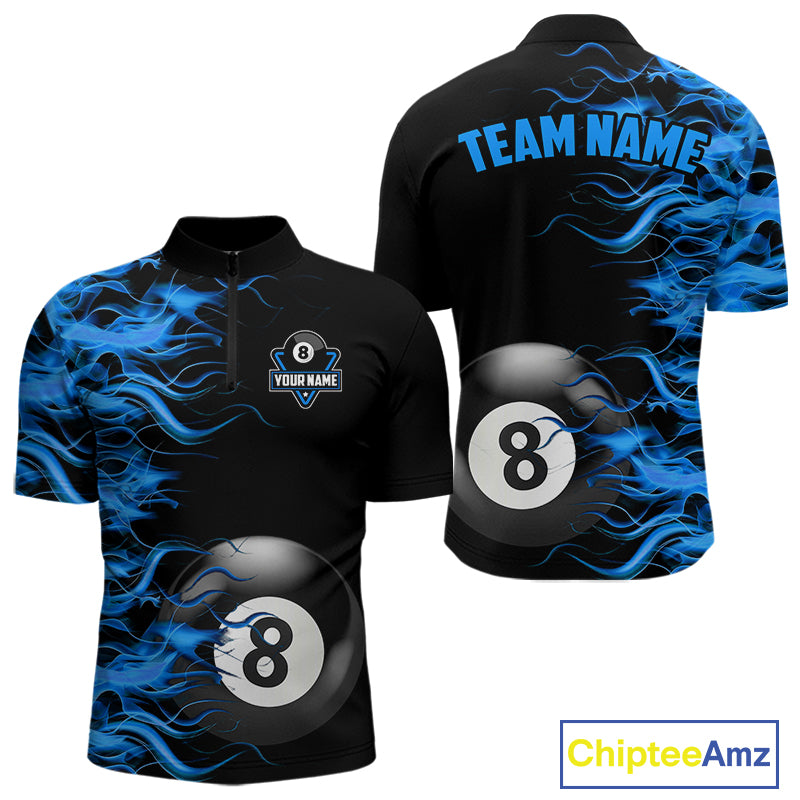 Personalized Blue Flaming 8 Ball Billiard Shirt For Men Custom Pool Team Jersey Polo & 1/4 Zip TDM4712