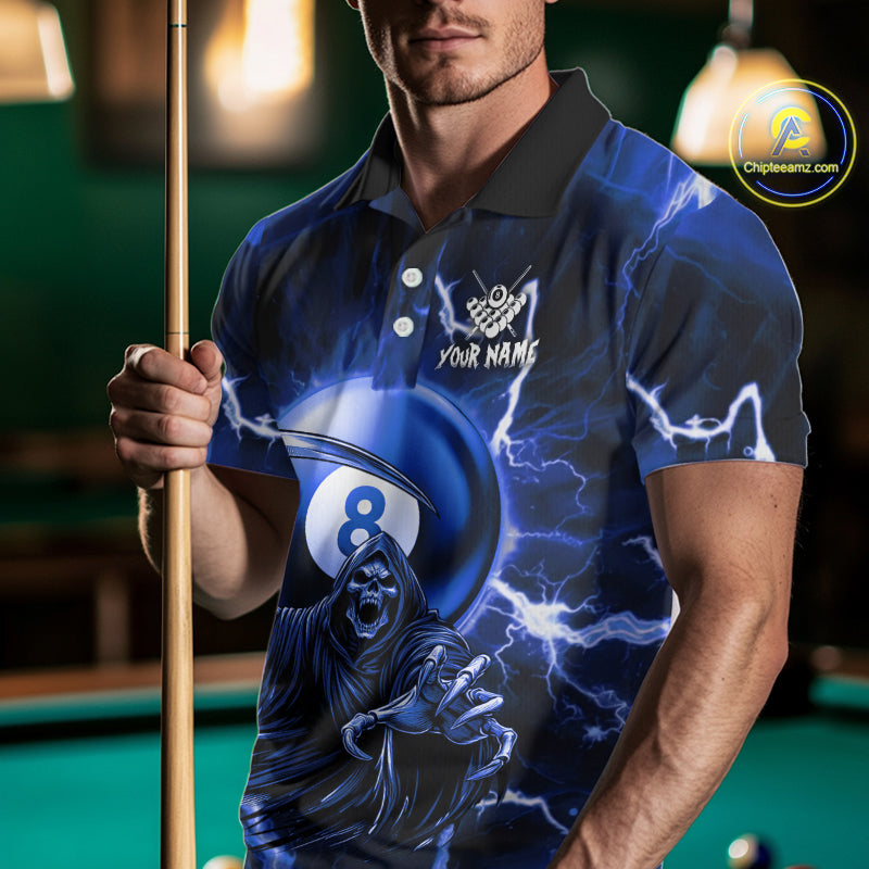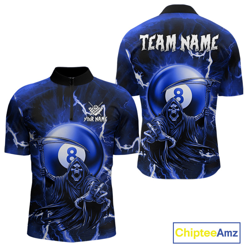 Blue Grim Reaper 8 Ball Billiard Shirt For Men Custom Lightning Pool Team Jersey Polo & 1/4 Zip TDM4957