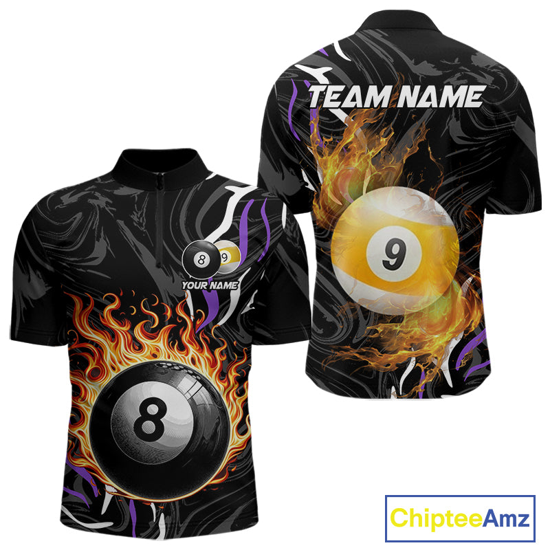 Personalized 8 Ball & 9 Ball Fire Flame Men Billiard Shirt, Billiard Jersey For Team Pooler|Purple TDM5210