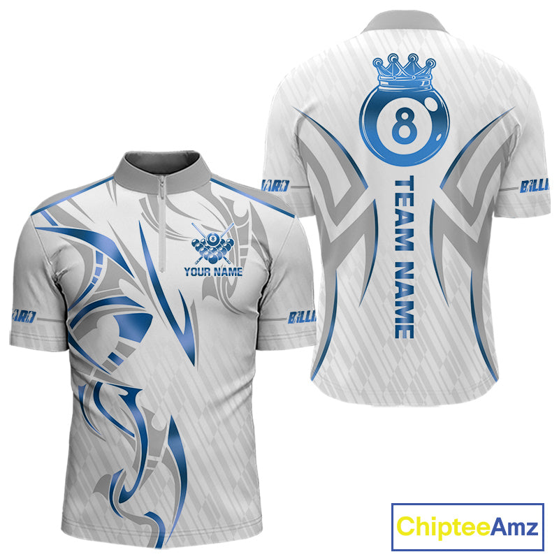 White And Blue Crown 8 Ball Men's Billiards Shirts Custom Billiard Jersey Team Polo & 1/4 Zip TDM5213