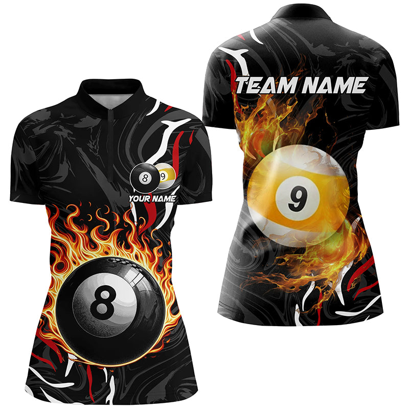 Personalized 8 Ball & 9 Ball Fire Flame Women Billiard Shirts, 3D Billiard Jerseys For Team Pooler TDM2504