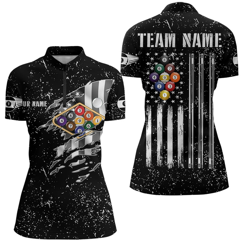 Personalized Black Grunge US Flag Billiard Balls Polo, 1/4 Zip For Women, 9 Ball Pool Billiard Jersey TDM3574