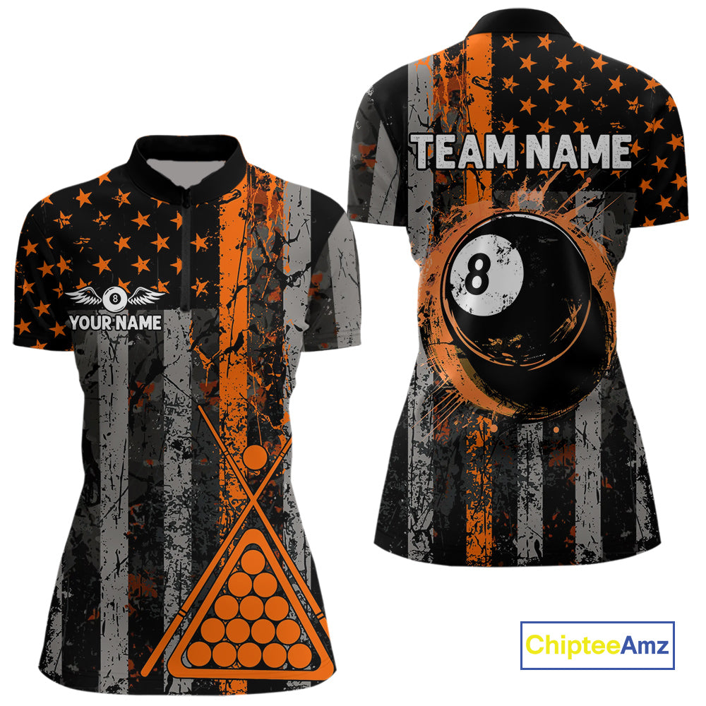 Custom Orange Grunge US Flag Patriotic Billiard Shirts For Women, Retro 8 Ball Pool Billiard Jersey TDM4046