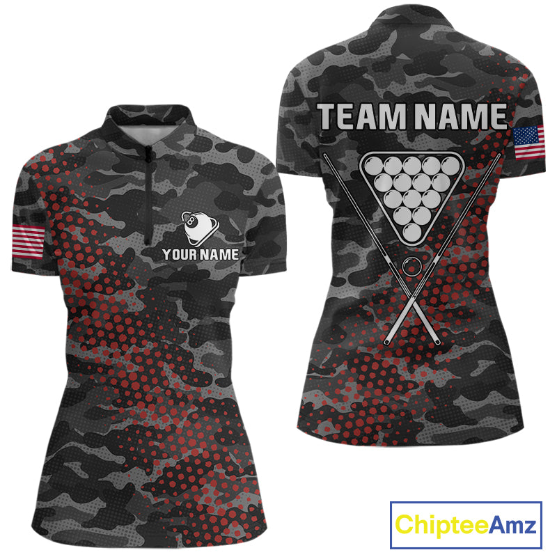 Personalized Red & Grey Camo Billiard Shirt For Women, 8 Ball Billiard Jersey Team Polo & 1/4 Zip TDM4431
