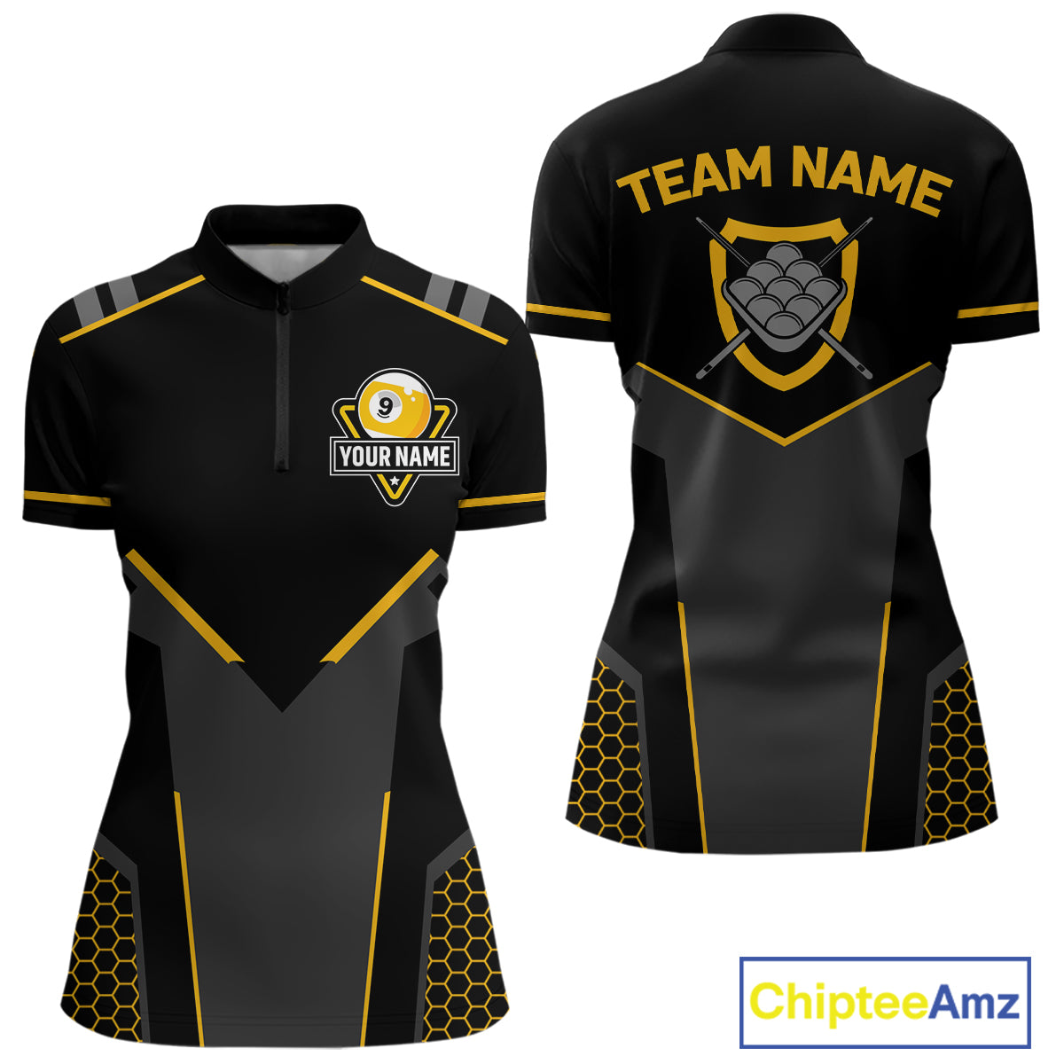 Personalized Yellow Black 9 Ball Billiard Shirt For Women, 9 Ball Pool Team Jersey Polo & 1/4 Zip TDM4476