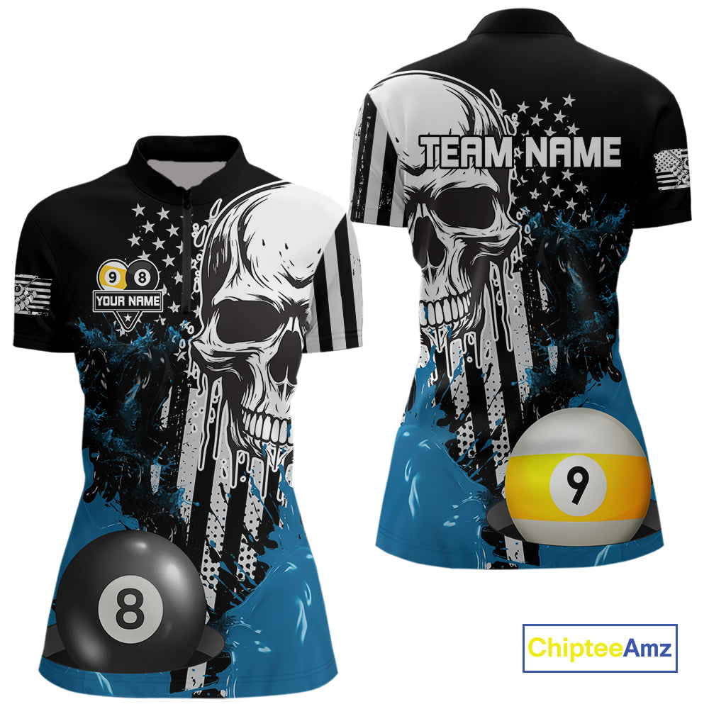 Personalized 8 & 9 Ball Pool Skull Billiard Shirt For Women Custom Grunge Billiard Team Jersey |Blue TDM4649