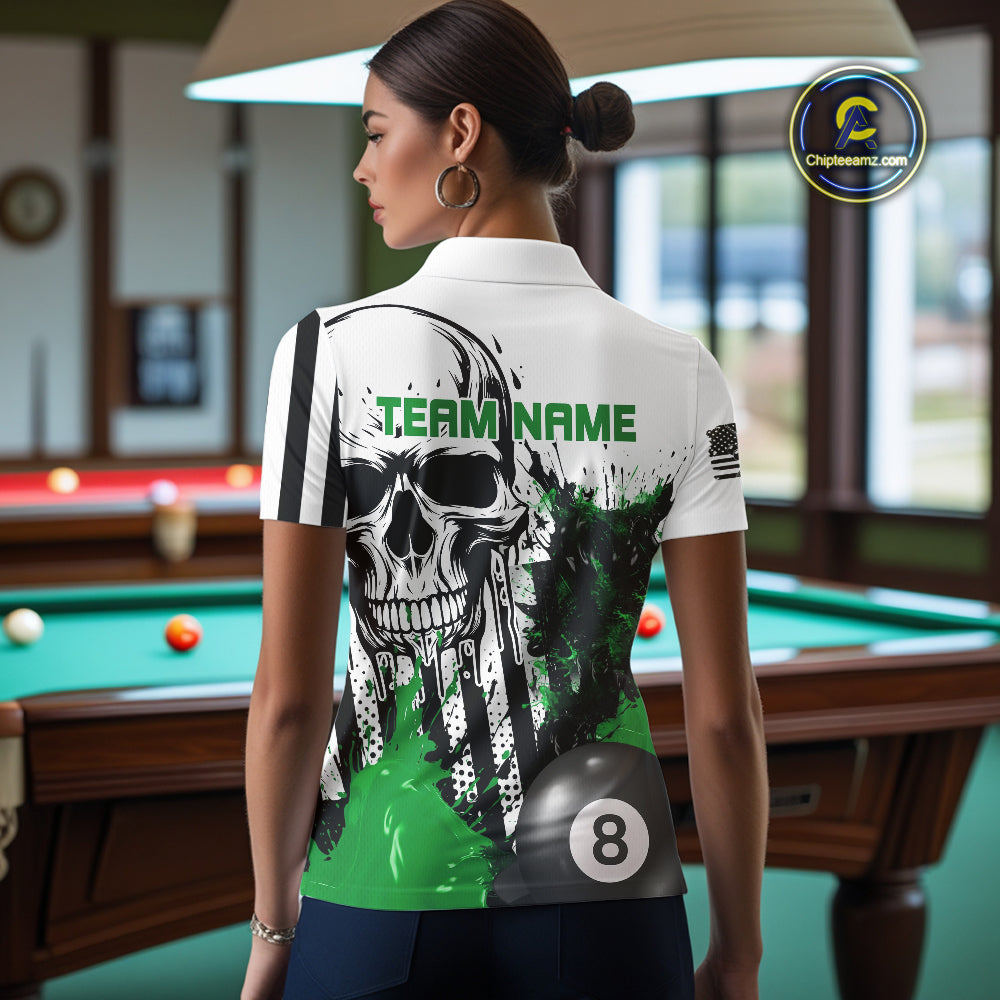 Personalized Green Grunge Skull Billiards Shirts For Women Custom Retro Billiard Team Jerseys Attire TDM4650