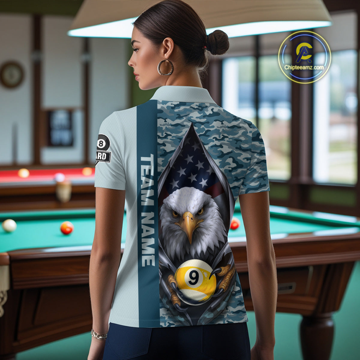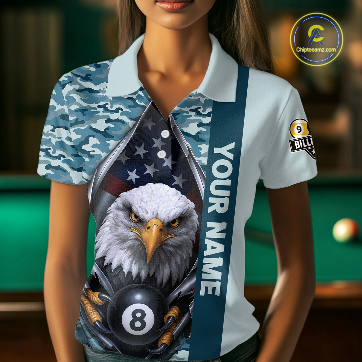 Blue Camo American Flag Eagle 8 Ball & 9 Ball Pool Jersey For Women Custom Billiard Team Shirt TDM4660