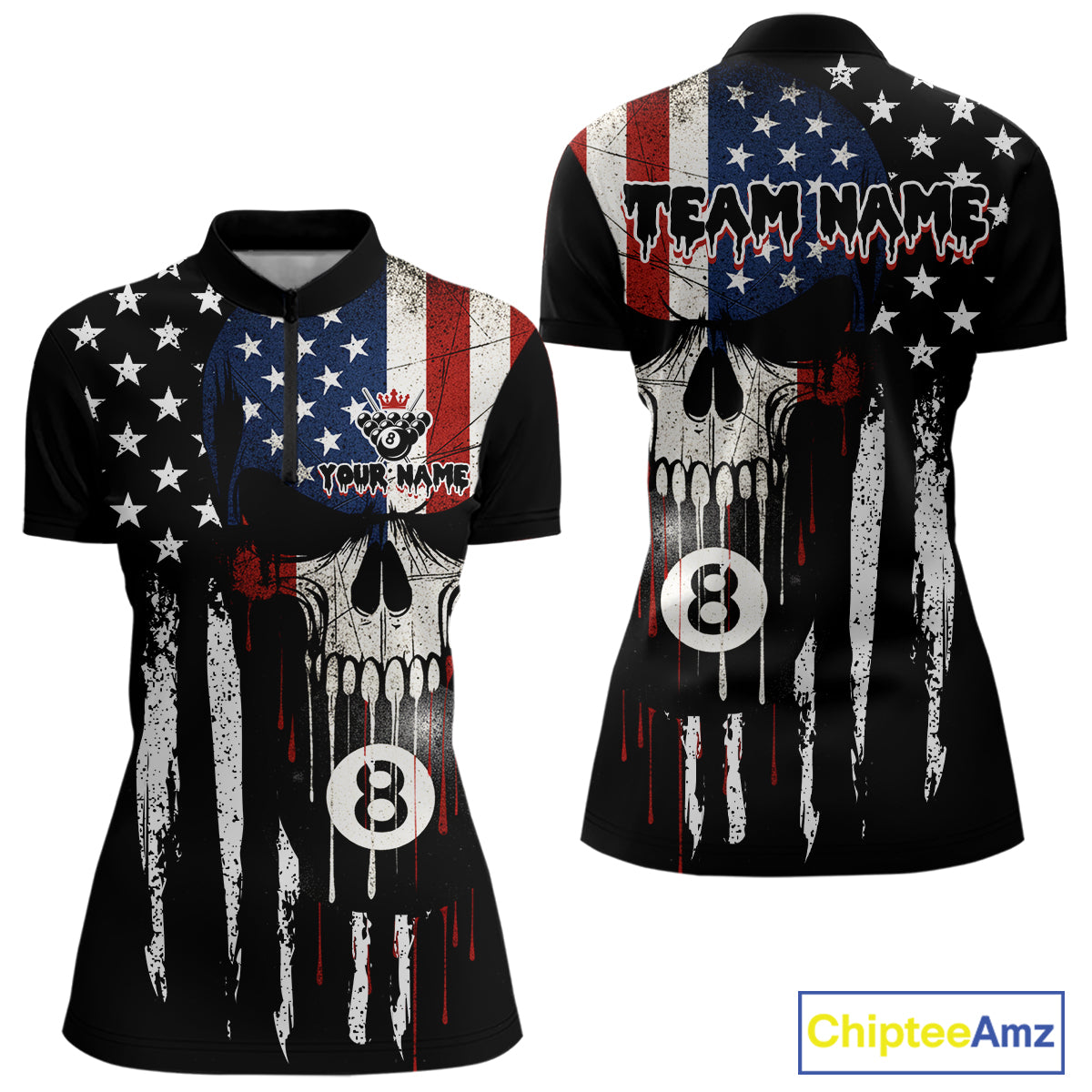 Grunge American Flag Skull 8 Ball Billiard Shirt For Women Custom Patriotic Pool Team Jersey TDM5042