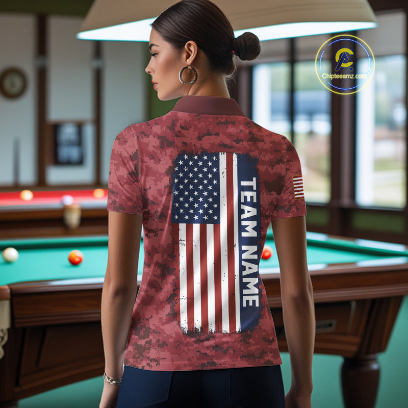 Personalized Red Camo Skull Billiard Shirt For Women Custom Patriotic US Flag Pool Team Jersey TDM5165