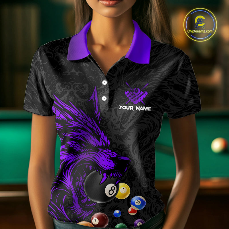 Personalized Wolf Billiard Balls Pool Shirt For Women, Black And Purple Billiard League Team Jersey TDM5203