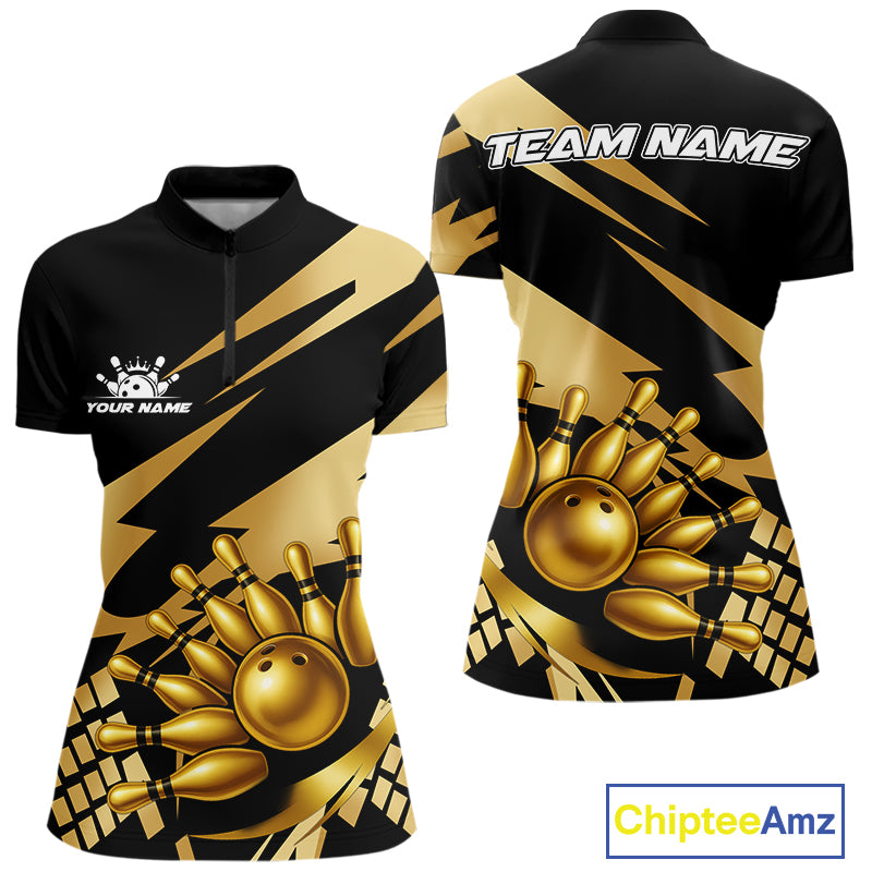 Black and Gold Bowling Polo, Quarter Zip Shirt For Women Custom Team bowling jersey, gift for bowlers NQS11069
