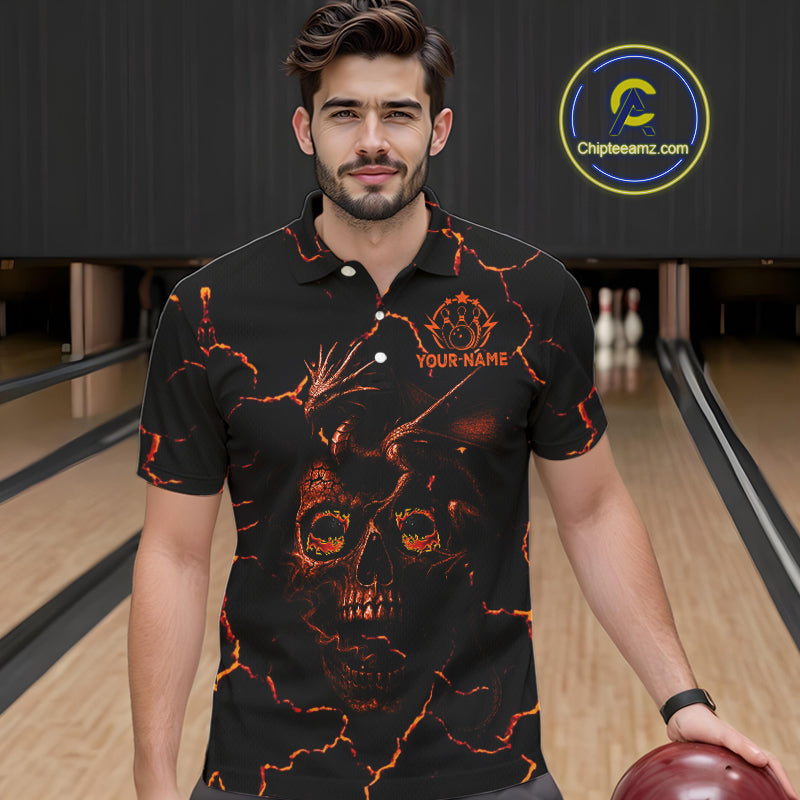 Black And Orange Skull Dragon Bowling Polo, 1/4 Zip Shirt For Men Custom Bowling Team League Jersey NQS10629