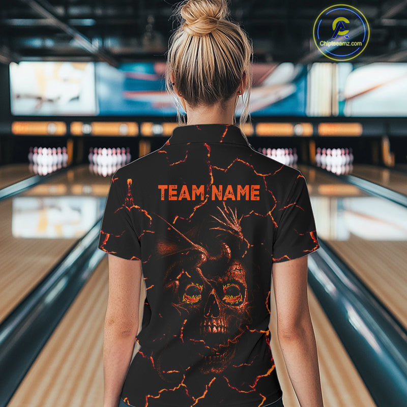 Black And Orange Skull Dragon Bowling Polo, 1/4 Zip Shirt For Women Custom Bowling Team League Jersey NQS10629