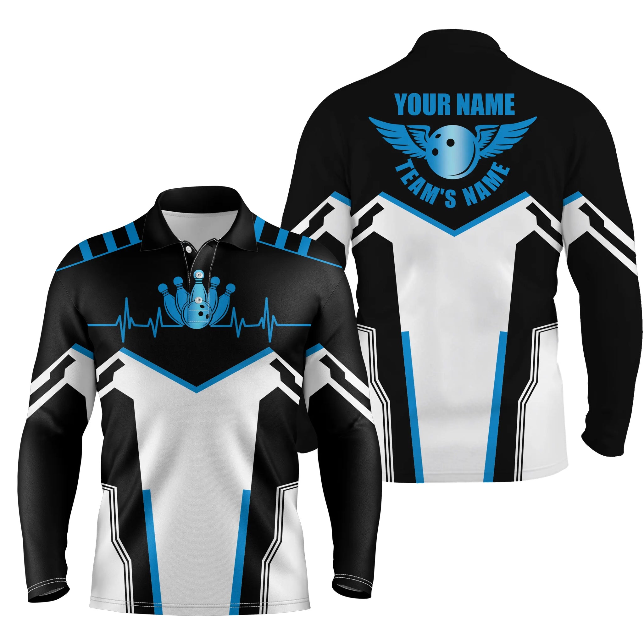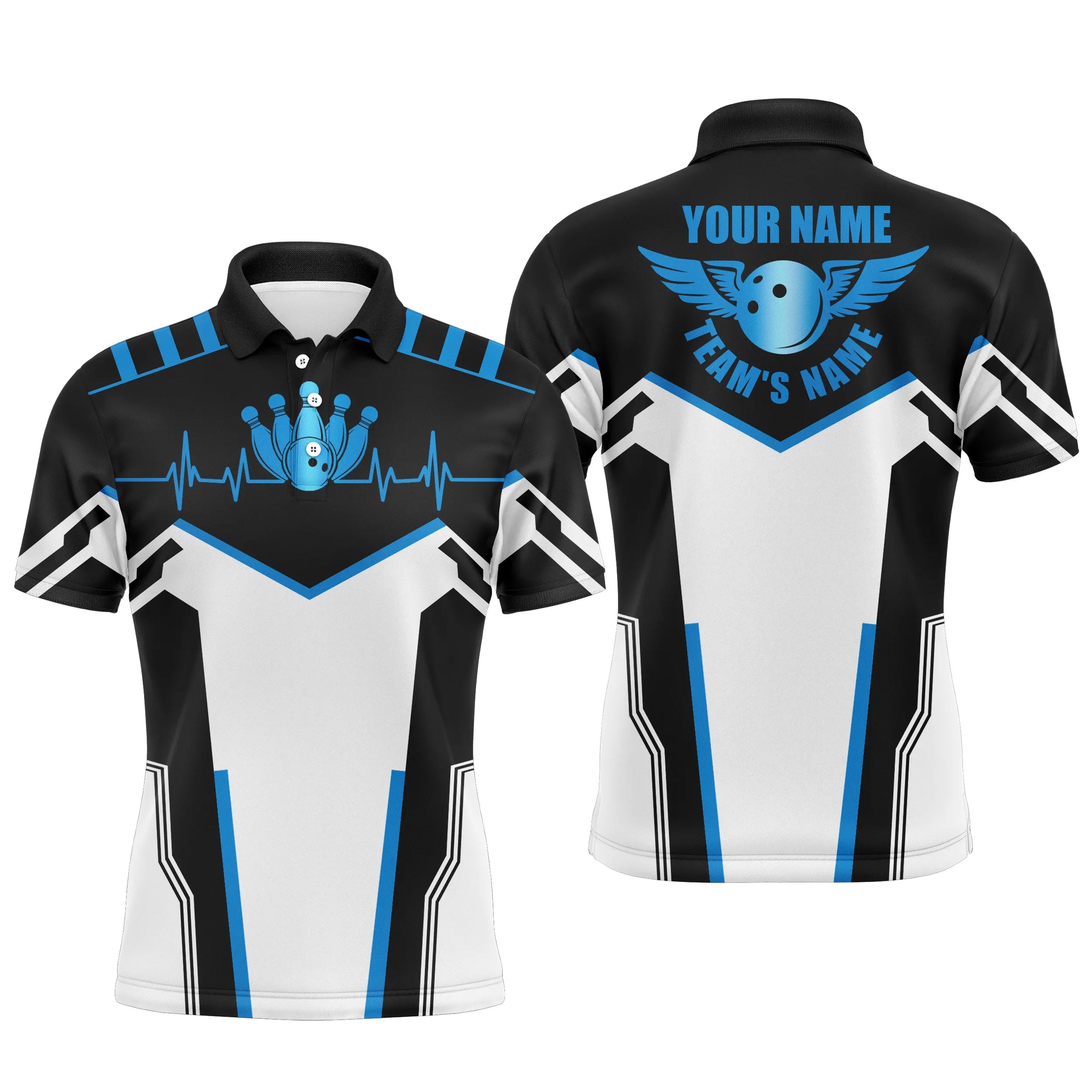Black and white Bowling shirts for men custom name, team name Bowling Ball & Pins mens polo shirts NQS4899