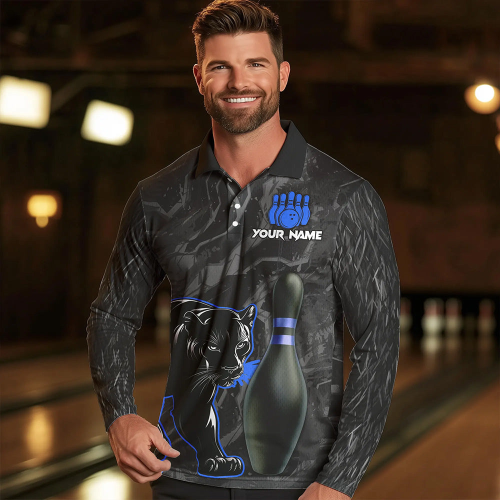 Black Camo Panther Blue Flame Bowling Polo, 1/4 Zip Shirts For Men Custom Bowling Team League Jersey NQS9443